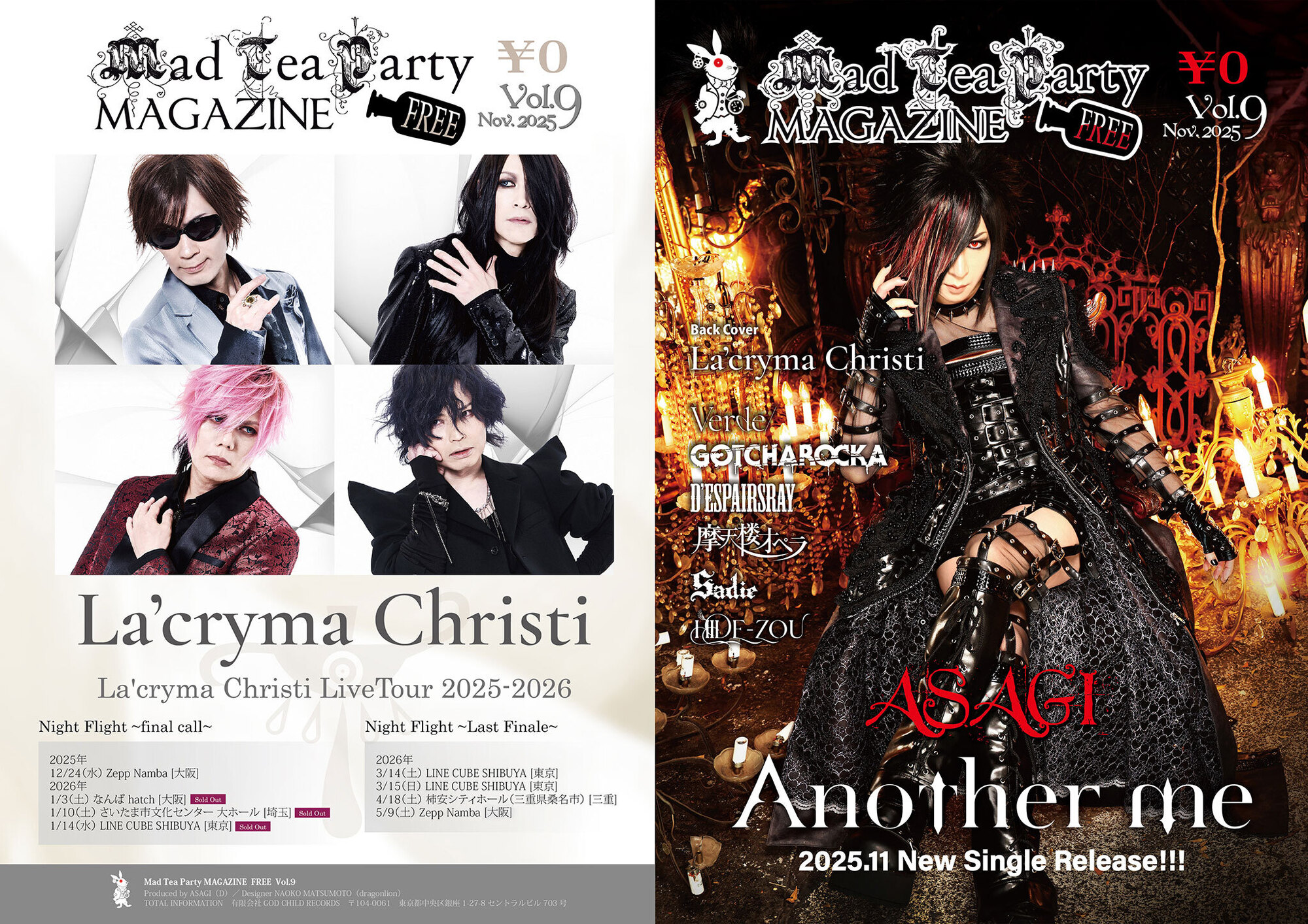 狂った饗宴。ヴィジュアル・ロックの深淵を覗き込むフリーペーパー『Mad Tea Party MAGAZINE FREE Vol.9』が、11月中旬より全国のロック・ショップ、タワーレコード、HMV、ヴィレッジヴァンガードほか主要CDショップやライブハウス等にて配布開始。表紙を飾るのは、Mad Tea Party MAGAZINEのプロデューサーでもあるASAGIだ。新曲「Another me」ではLedaの鋭刃ギターと初参加のIKUO(Rayflower/BULL ZEICHEN 88)の洗練されたベースが唸る。またLEVIN(La'cryma Christi)の繊細かつ重厚なビートはASAGIの闇の叙事詩に深みを加える。自我の裂け目を抉るその眼差しは、まるで血塗られた鏡の向こう側からこちらを誘うようだ。裏表紙には、12年ぶりのワンマン・ツアー『Night Flight final call』を目前に控えたLa'cryma Christiが佇む。TAKAの涙腺を抉るヴォーカル、HIROの叙情ギター、熱く唸るSHUSEのベース、感情を呼び起こすLEVINのドラム。そしてKOJIの魂は今もバンドの旋律に息づき、光として永遠に輝くだろう。11月15-16日のCROSS ROAD Festを皮切りに、彼らの夜の飛行は続くのだ。
