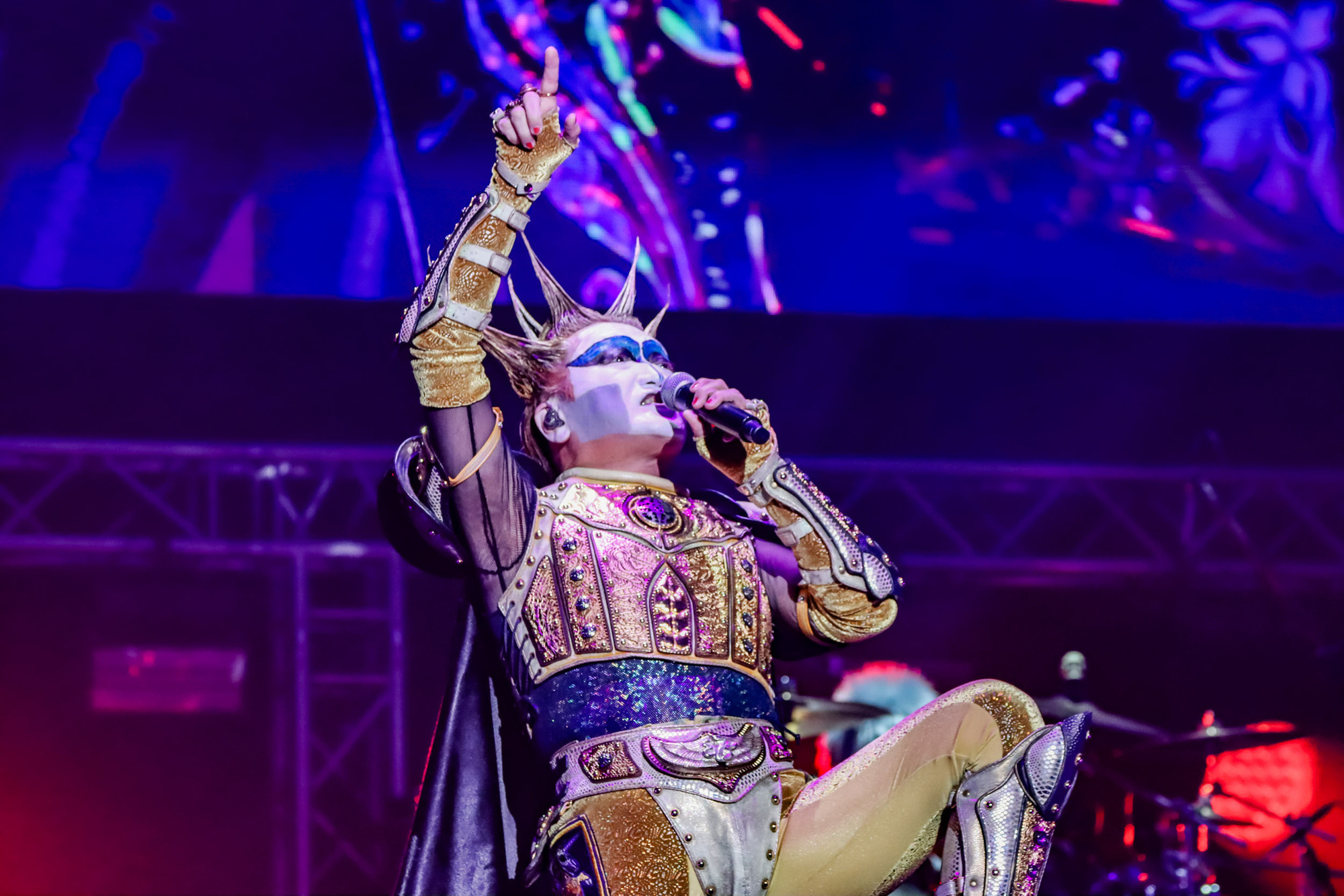 歌唱1曲目の「LOVE LETTER FROM A DEAD END」からアリーナの熱が一気に爆発する。切り裂くようなギターの音が胸を撃ち、デーモン閣下の声がまるで竜巻のごとく会場を支配する。観客は両腕を掲げ、全身でその音を受け止める。長崎の夜が瞬く間に、近未来的な重厚さと疾走感をまとう世界に包まれてゆく。 続く「Masquerade」ではインダストリアルな音色と人の心をノックする言葉が幻想的な照明とともに妖艶な空気をかきたて、続いて放たれた「老害ロック」では、ロックの力を見せつけるかのように、熟練ならではの激しくも痛快な演奏が炸裂。閣下のユーモアを交えた歌によるインプロヴィゼーションも冴えわたり、長崎の信奉者たちを笑いと喝采で鷲づかみにした。
