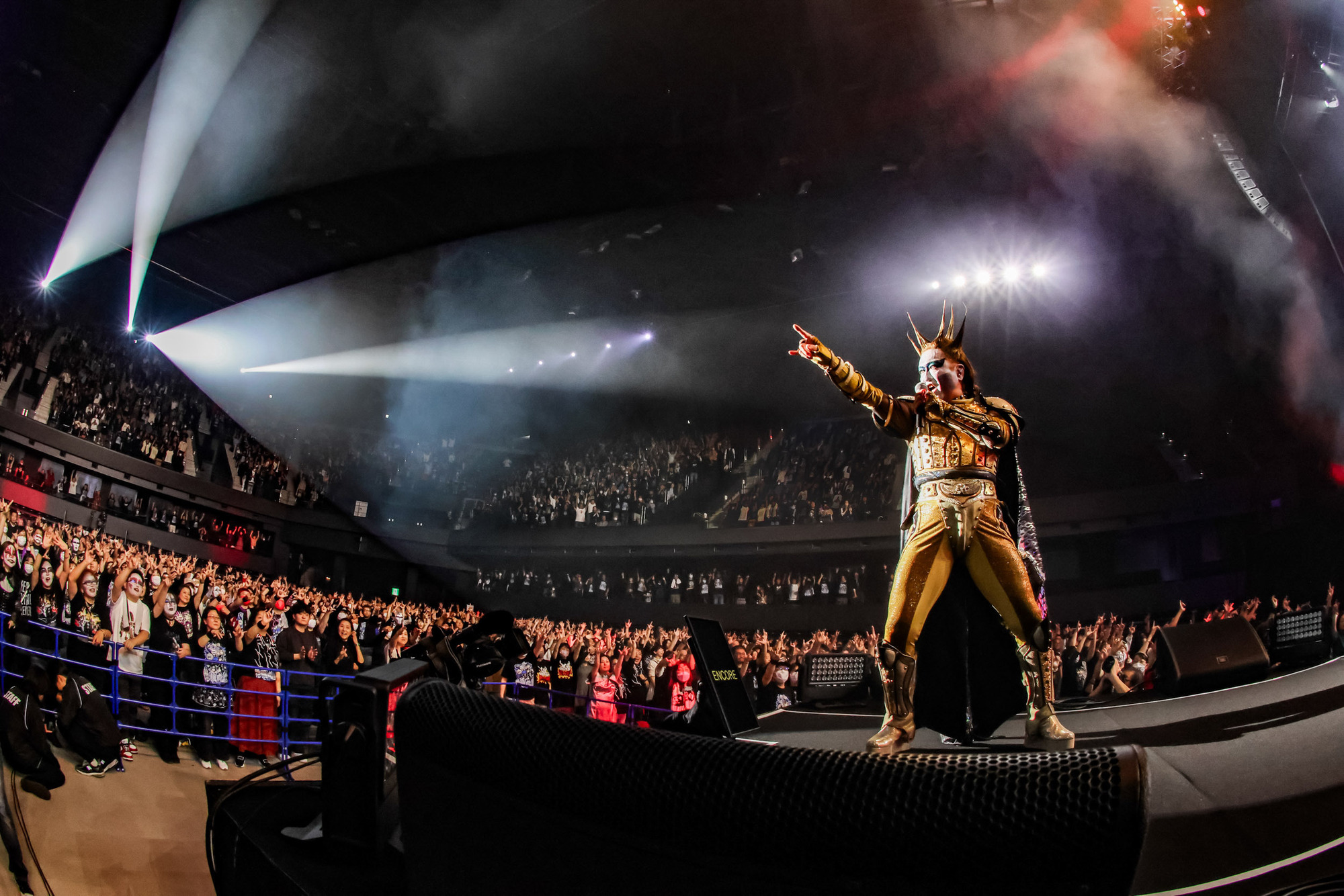 うねりに漂う観衆に、最新大教典の明快なメッセージソング「Next Is The Best!」が急襲、本年の全国ツアーでも披露していない曲にコアな信奉者たちがたちまち熱狂の悲鳴をあげた。平均年齢10万61歳を超えていることが信じられないパワーの塊に驚愕していると追い打ちが来た。聖飢魔Ⅱのゼッタイ看板曲「Fire After Fire」。エナジーと貫録はその名の通り炎のようなど肝を抜くステージングで嵐のような本編フィナーレを迎えた。