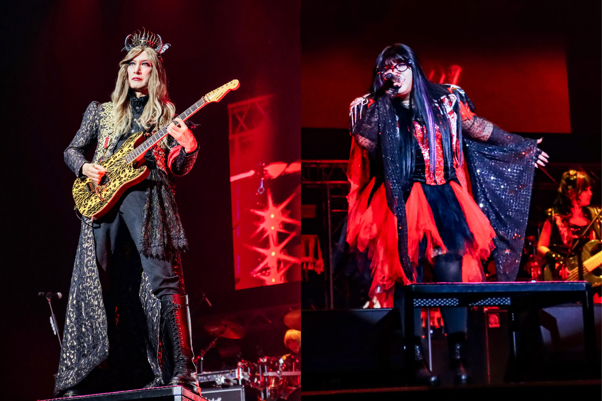 続いて披露されたKAMISORI SYUTOのドラマティックなピアノソロから始まる「Eternal Sinner」でD.H.C.の音楽性の奥深さを見せ、次に披露した「天空の放浪神」では、純度100%の様式美ヘヴィメタルで襲う美しき音の洪水が聴く者の意識を奪っていく。まるでステージ全体が一つの生命体となって脈動しているようで、観客の歓声がそれに応える。そしてクライマックス、「嵐が丘」が始まった瞬間、アリーナの空気がさらに張り詰めた。RENOファウストとアックスKAZUMAが左右のお立ち台へと飛び乗り、二人のギターが交錯し、そしてダミアン陛下もお立ち台に上がりトリプルギターによる雷鳴のようなフレーズが空間を切り裂くと、リリス一ノ瀬のベースが唸りを上げ、KAZAMIクロウリーが用いるチタン製のドラムが、重厚なドラミングとともに地鳴りのような低音となり床を伝う。観客の歓声が再び爆発し、会場中央へ伸びる花道をメンバーたちが悠々と歩き、こうしてD.H.C.のライヴは大熱狂の中終焉を迎えた。