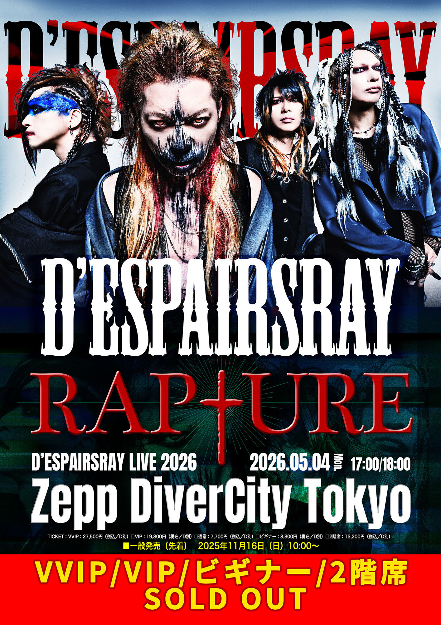 14年ぶりの単独公演として大きな注目を集めている D’ESPAIRSRAY 2026『RAPTURE』 の一般チケットが本日、11月16日(日)10時より販売開始となったが、VVIP/VIP/ビギナー/2階席がすべてソールドアウトにつき、残すは通常チケットのみとなっている。