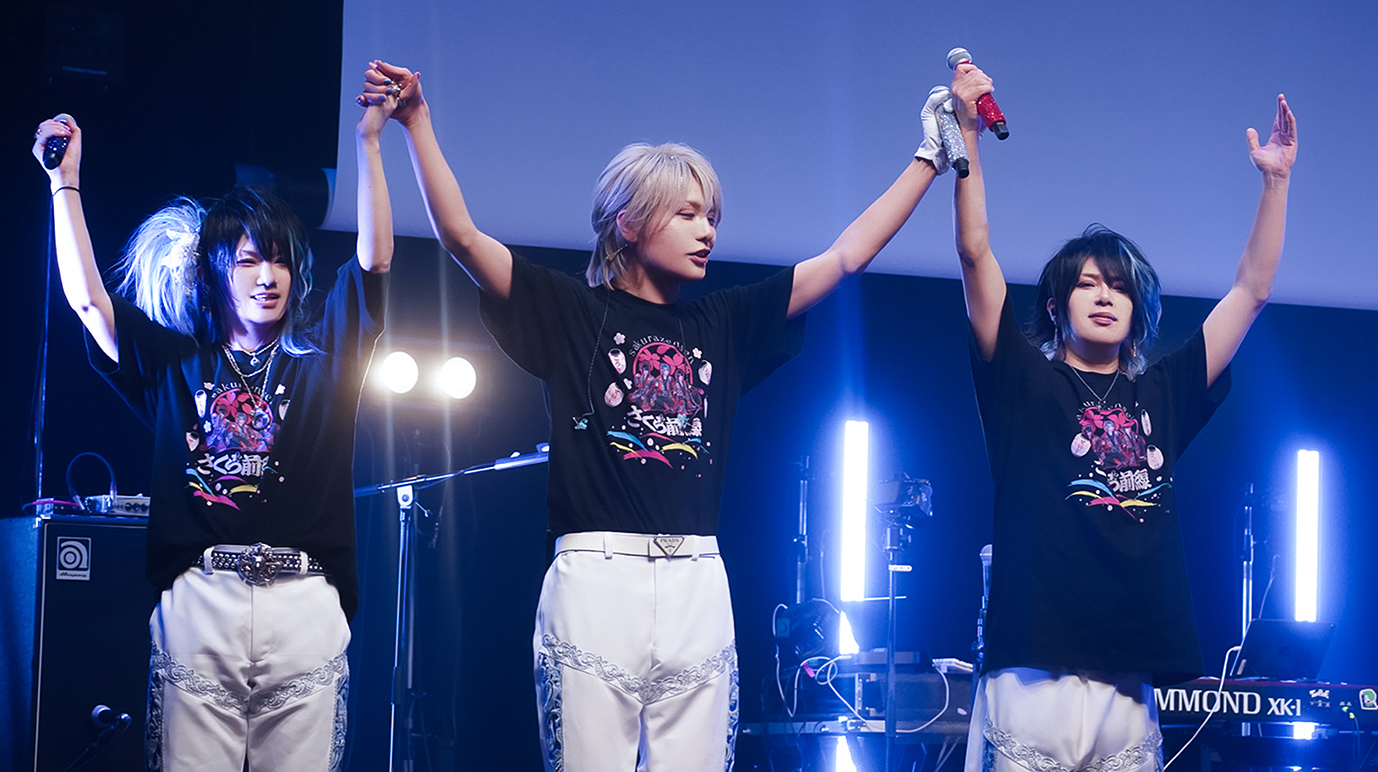 最後の登場は『こうき』登場を締めくくる満面の笑顔で会場のボルテージは最高潮へ高まったところで『こうき』『つかさ』『せいじ』の順で煽りバンドがそれに応えると1曲目は名刺代わりの曲『最美桜音頭』が始まる。