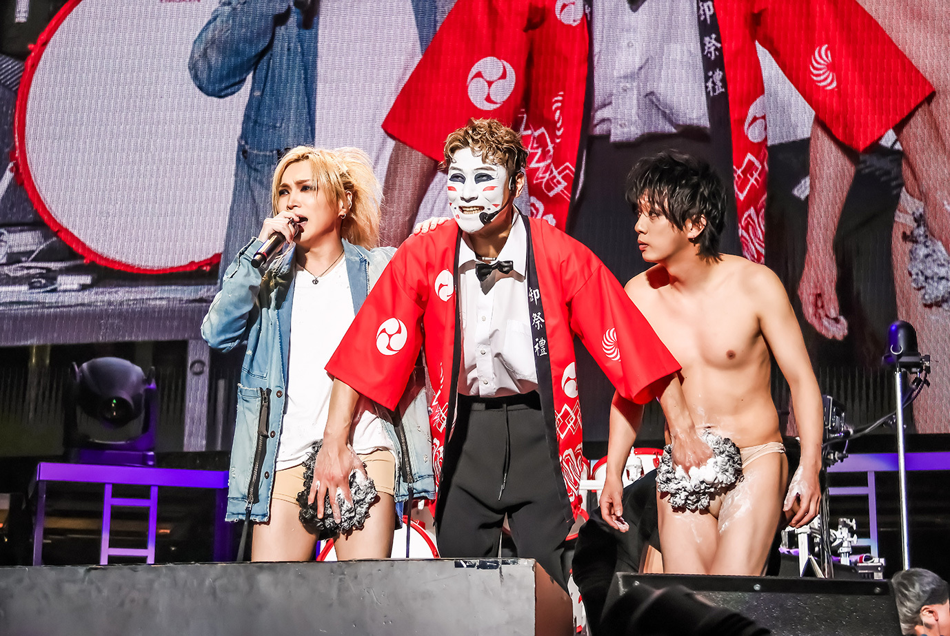 そのあとのギターソロでは、喜矢武がまさかの“下半身アフロ”姿で登場。途中、鬼龍院も“下半身アフロ”姿になり、樽美酒がアフロ部分にシャンプーまでし始めるというカオスな展開に。樽美酒は、最近パチンコ店でアルバイトを始めたという話から、ノリノリでパチンコマイクパフォーマンスを披露して、会場を沸かせた。
