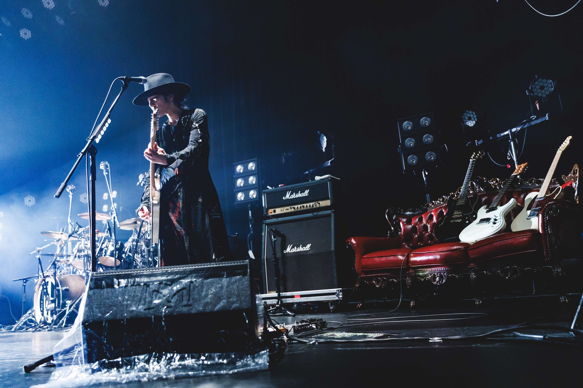 しかも、それらの頭部は映像モニターとなっていた。また、ギタリスト・aieの立ち位置より少し後ろにはアンティークな雰囲気の赤い革張りのソファが置かれており、そこはギター置き場として使われている模様。かと思えば、やや下手側にはこれまたかなり古びたデザインのウッドチェアがしつらえられていて、背もたれの上部には金属製の器具が取り付けられているらしく、どうもそのデザインは映画『グリーンマイル』に登場していた“例の椅子”に限りなく近かった。
