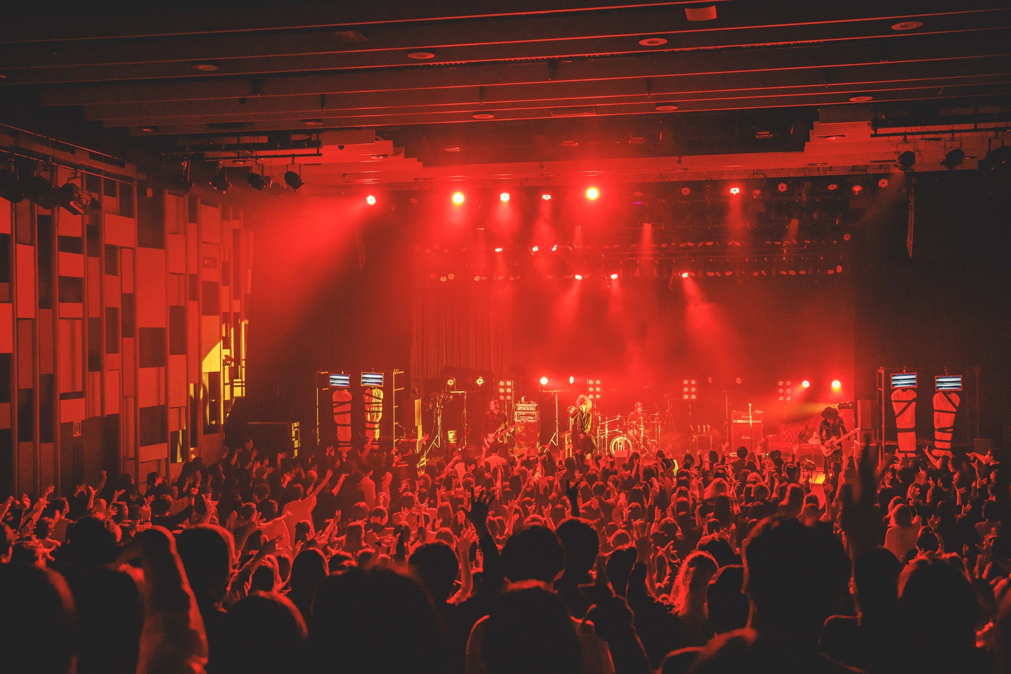 特に、今回の公演においては「蟻塚」を真っ暗に照明を落とした中で演奏してみせたくだりでホールだからこその特性が最大限に活かされており、暗闇の中で眞呼のエクステとメイクの一部分のみがブラックライトで浮き上がるというある種の異様な状況下、鬼気迫る各プレイヤーの音と眞呼の憑依性の強い歌が重なることにより、ホール内に現世とはだいぶかけ離れた異世界が出現。