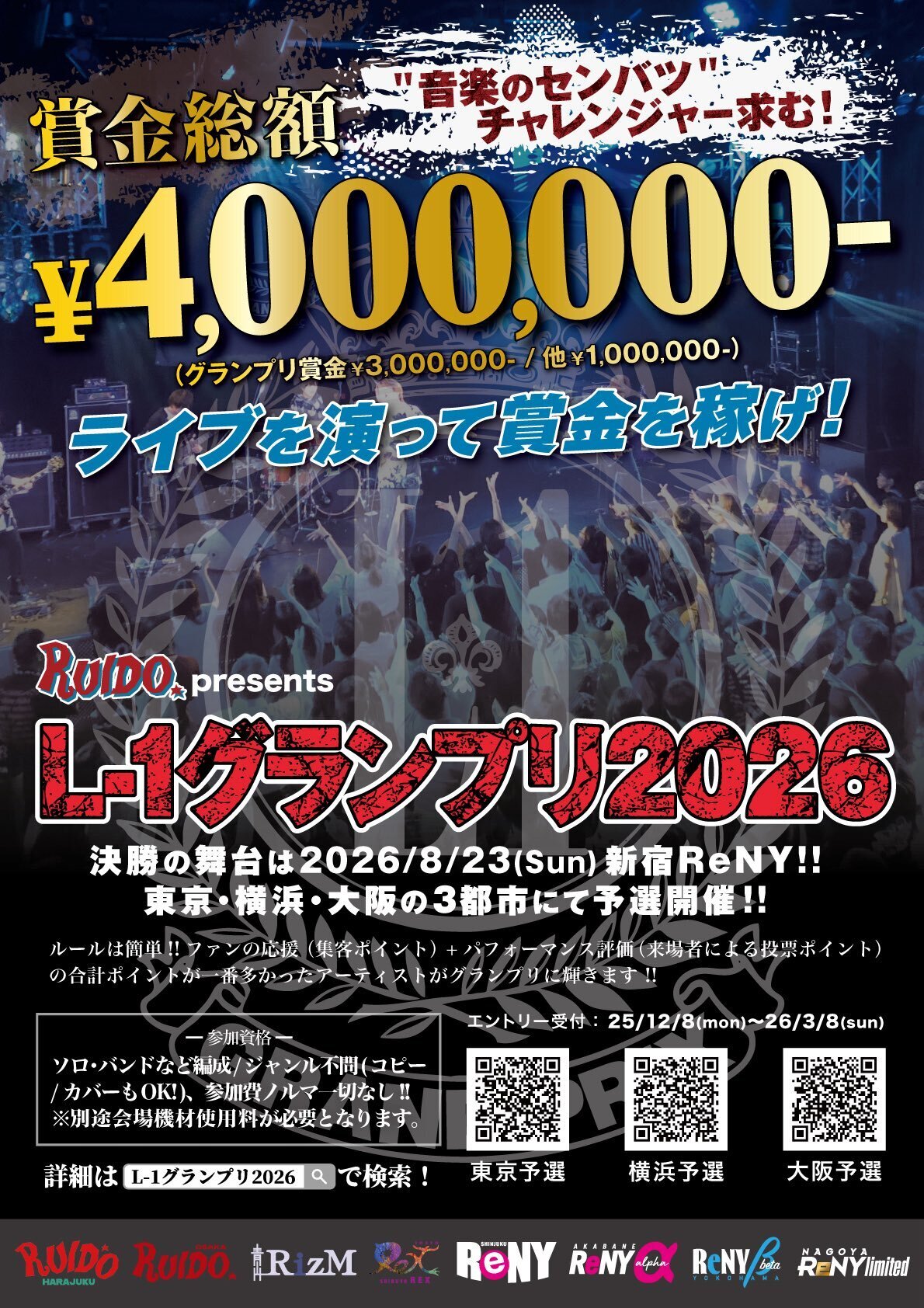 『RUIDO presents L-1グランプリ2026』が、2026年4月より東京・神奈川・大阪のRUIDOグループ各系列店を会場に開催される。