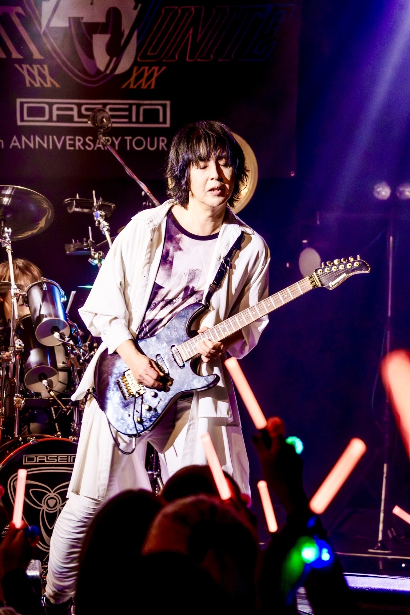 一転、Rickyがスケールの大きいミドルメロウの『燦然たる我が人生』を朗々と歌い上げ、胸を揺さぶる壮大なロックオペラの世界へ観客たちを招き入れた。Rickyは手にしたフラッグを高く翳し、ここにいる大勢の仲間たちに向け、共に輝かしい人生を謳歌しようと呼びかけていた。まさに今のDASEINは、輝く未来へと導く道標のような存在だ。