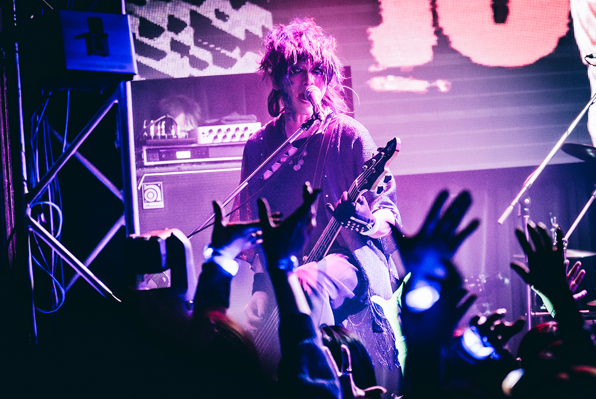2デイズライブの幕を開けは「FREAK PARADE」だ。ビジョンに映し出される女型のアンドロイドが、Luv PARADEの無機的でありながら怪物級の轟音世界に、サイバーな色を添える。この2日間は全編に亘りビジョンにVJ映像が映し出され、Luv PARADEの世界を4人が繰り出す音と共に描いていった。「FREAK PARADE」をフルスロットルで披露すると、ノリの良いビートと美しいメロディが交差するロックチューン「SHOOT IT DOWN」、退廃的な美しさが拡がっていく「HameIn」と、初っ端から容赦なく攻めていく。