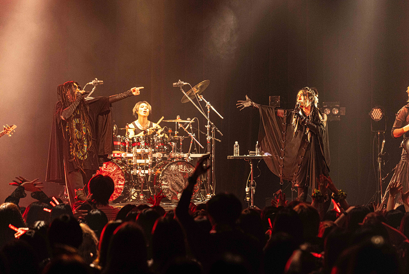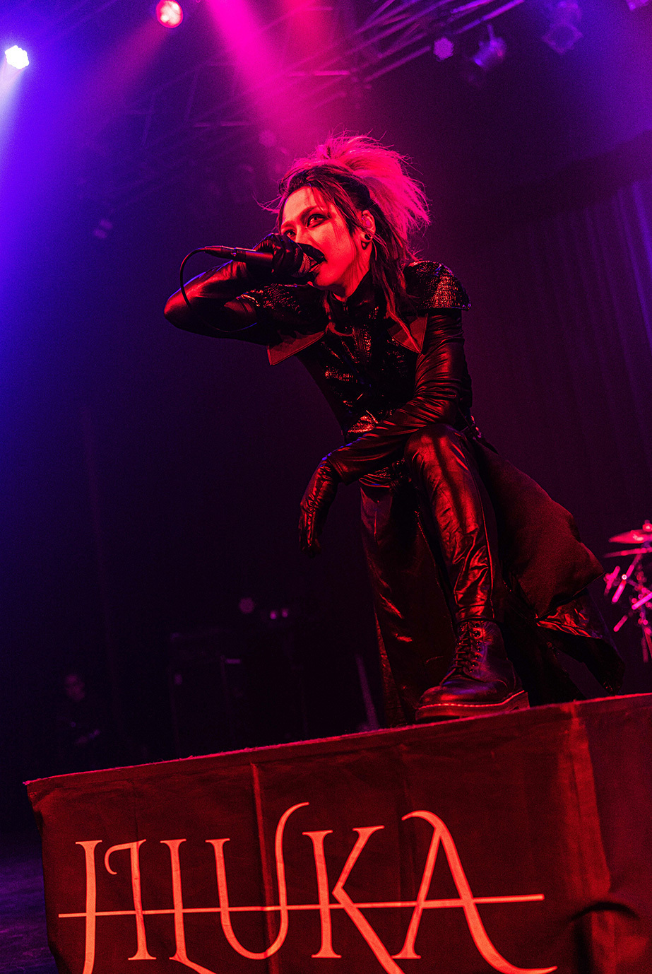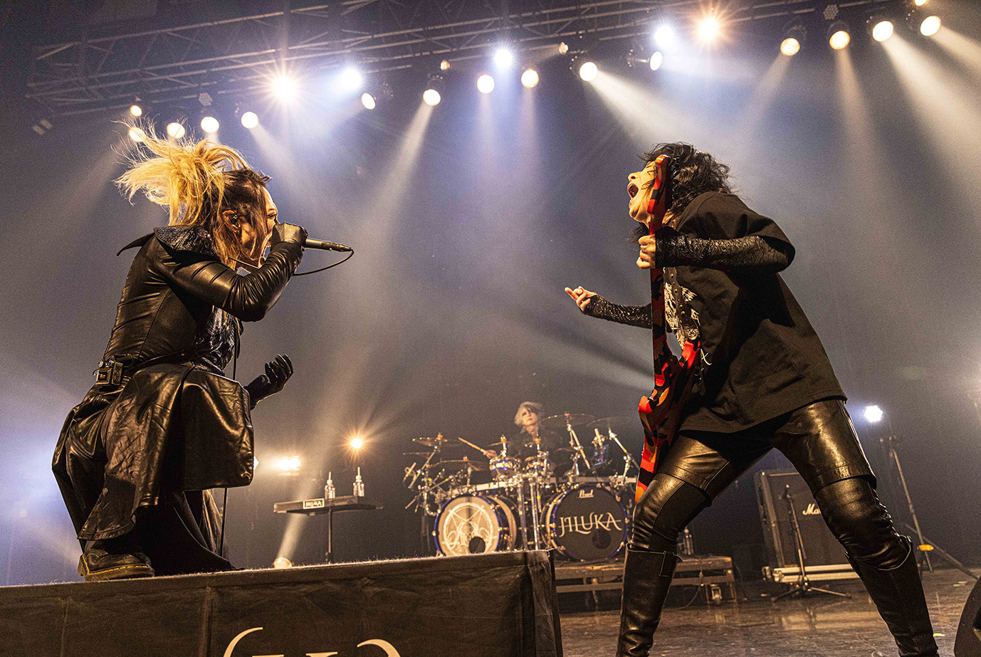 初日の公演は団長とmachineでサポート・ドラムを務めるCHARGEEEEEE..による軽妙なMCを経て、JILUKAのライブから始まった。現在のJILUKAは“EGM(エレクトロ×ゴシック×メタル)”というコンセプトのもとに独自の音楽性を構築していることで知られている。Ricko(vo)のアグレッシブなシャウトやSena(g)のソリッドかつフラッシーなギター、Boogie(b)とZyean(dr)による重厚なリズム・セクションなどを押し出したハードネスとメロディアスなサビや荘厳なオーケストラ、デジタル・テイストなどを融合させた楽曲は非常に魅力的だ。ドラマチックなサウンドとメンバー全員が織り成す激しいステージングを活かしたJILUKAのライブの駆り立て力は圧倒的だし、今回のライブでは「Screamer」にKiyoshiが飛び入りしたことも相まってオーディエンスは熱いリアクションを見せ、<ULTRA BEAST HAMMER BATTLE>は上々の滑り出しとなった。