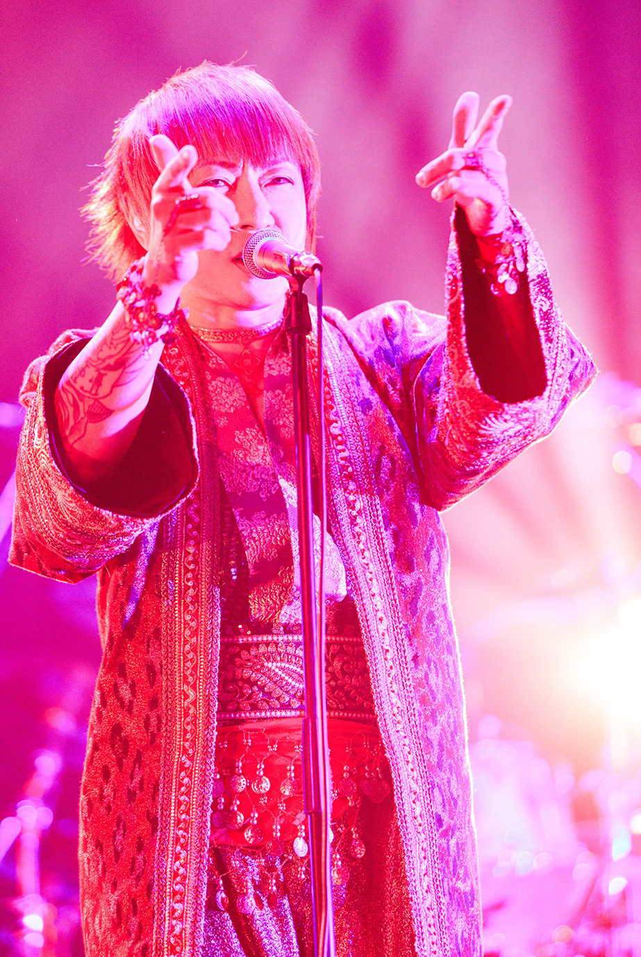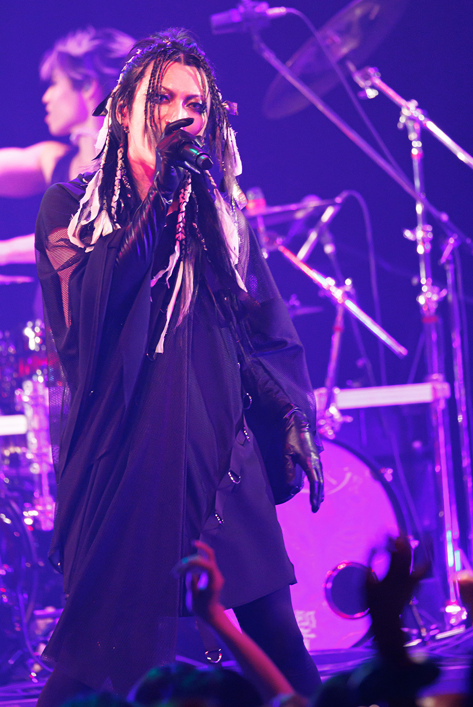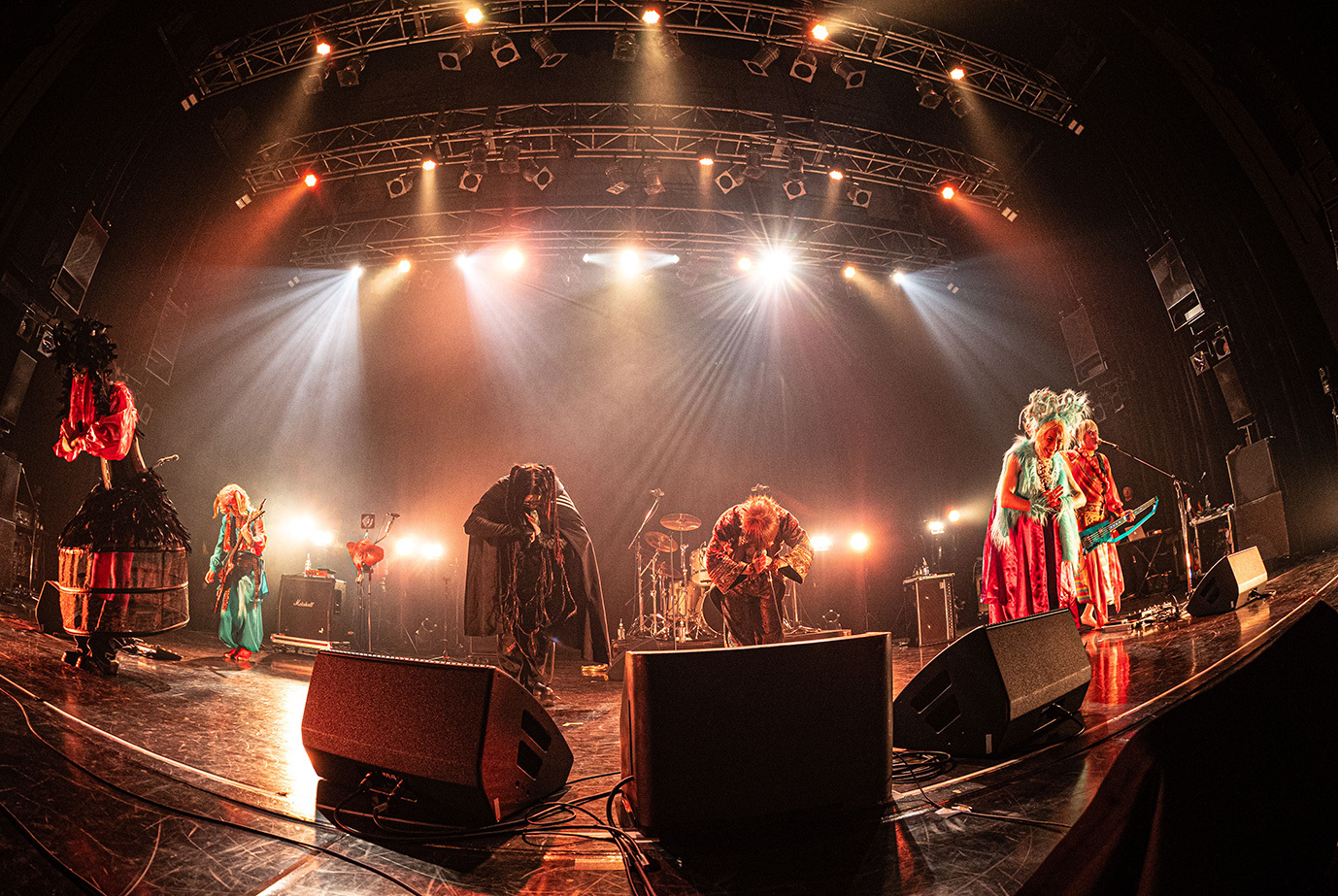 続いてステージに立ったPsycho le Cémuのライブは「君がいる世界」からスタート。メンバー全員が極彩色の衣装に身を包んだカラフルなヴィジュアルとキャッチーなサウンド、そしてseek(b)を始めとしたフィジカルなステージングなどにより、ライブが始まると同時に場内をPsycho le Cémuの世界に染めたのはさすがといえる。さらに、ライブ中盤ではDAISHI(vo)とAYA(g)、YURAサマによるダンスをフィーチュアしたスタイルで「シャクティ シャクティ アスティ」や「激愛メリーゴーラウンド」(HAKUEIが参加した)などを披露。妖艶かつ華やかなステージでオーディエンスを惹き込んだ後、グルーヴィな「MOON PRISONER」や煌びやかに駆け抜ける「愛の唄」で気持ちを引き上げるという巧みな構成でオーディエンスを大いに沸かせてみせた。