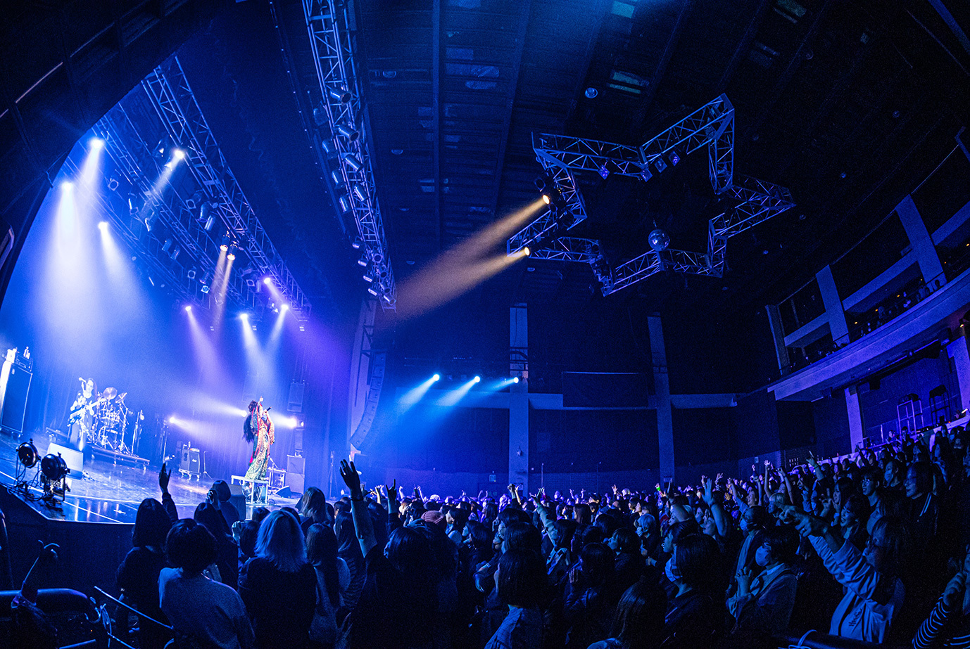 陰りを帯びたオープニングSEが流れる中ステージに姿を現した有村竜太朗は、「≒engeki」からライブを開始。軽やかな哀愁を湛えたサウンドと儚さを感じさせる歌声が生む深みのある世界は非常に魅力的で、オーディエンスが深く惹き込まれたことが如実に伝わってきた。その後は内向的な歌中と力強いサビの対比を活かした「猫夢 / nekoyume」やせつなさと疾走感を融合させた「くるおし花 / kuruoshibana」などをプレイ。表現力に富んだボーカルはもちろんバックを務めるDEMONSTRATIONsの演奏も上質で、特に色彩豊かなアプローチ/プレイで楽曲のエモーションを増幅させる悠介(lynch.)のギターワークは見事なものだった。ライブ後半ではHAKUEIを交えたスタイルで披露したパンキッシュな「≒jukyusai」と力強くドライブする「≒fuyuu」を続けてプレイ。徐々に温度を上げていくライブ構成が見事に決まって、場内はいいムードで盛り上がった。