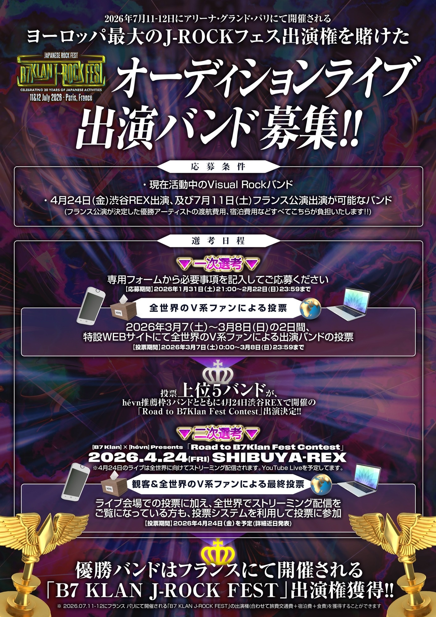 こちらのフェスへの出演権、最後の一枠をかけたオーディションライブの開催が決定した。現在活動中のヴィジュアル系ロックバンドに応募資格があり、オーディションライブは4月24日(金)、渋谷REXにて開催される。募集後、特設WEBサイトにて全世界のV系ファンによる、出演バンドの投票(第1次選考)を経て、オーディションイベントへ出演したバンドの中から、ファン投票で選ばれた1位のバンドがフランス公演の出演権を手に入れることができる。