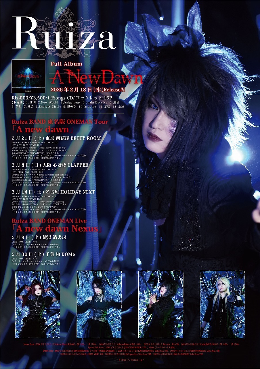Ruizaは、アルバム『A New Dawn』を手に、2月21日よりRuiza BAND東名阪ONEMAN Tour「A New dawn」を行う。今回は、Ruiza筆頭に、メンバーのTsunehitoと美景の生誕祭も、それぞれ公演ごとに行われる。7月以降に始まるライブの展開も発表。これから始まる怒濤のライブ攻勢に向けても、彼はこのような言葉を寄せてくれた。