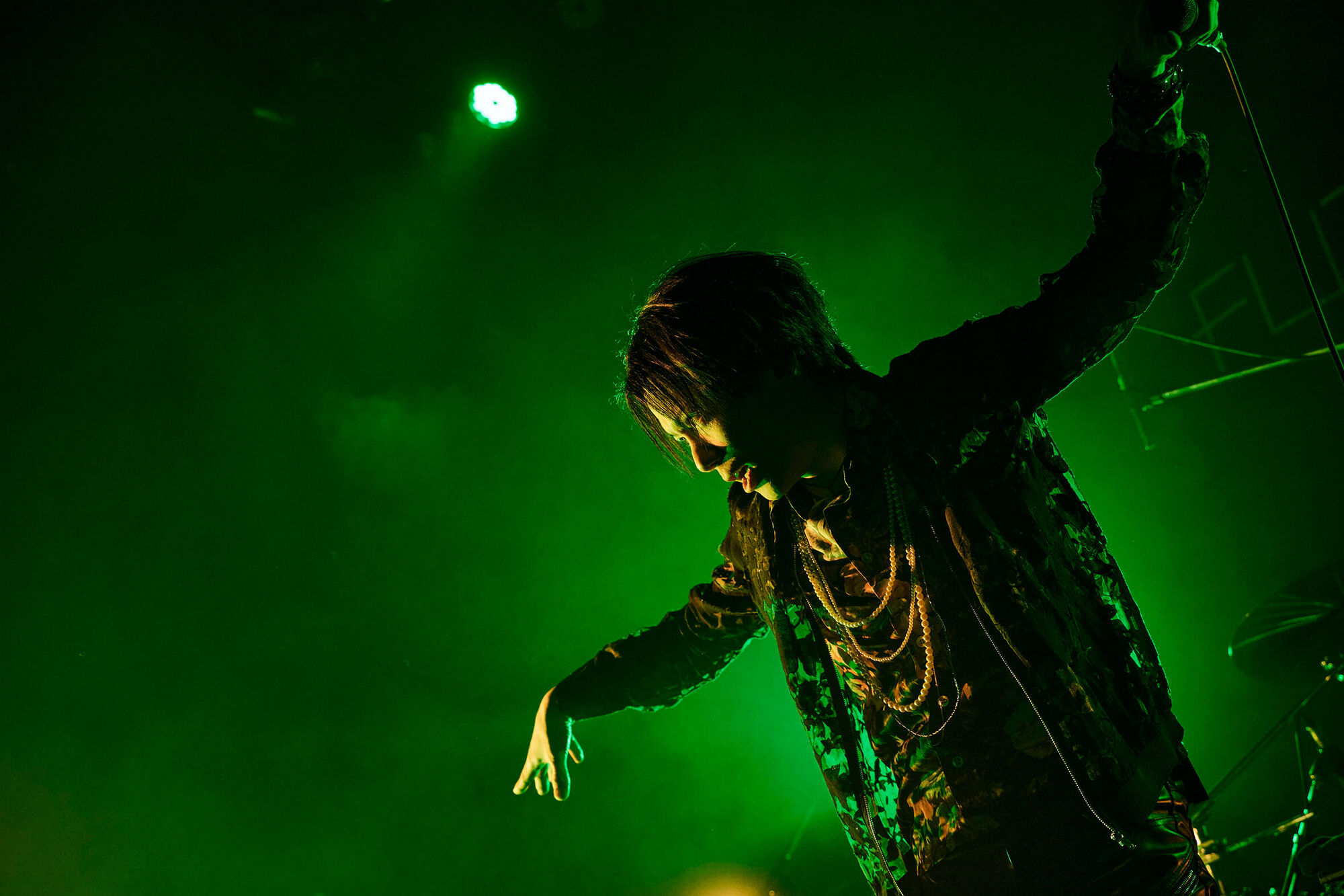 「Set The Fire !」では、一瞬ステージ全域が真っ赤に染まる照明演出に息を呑み、Shinjiはその後、ステージ下手側の階段を駆け上ってサブステージへ。