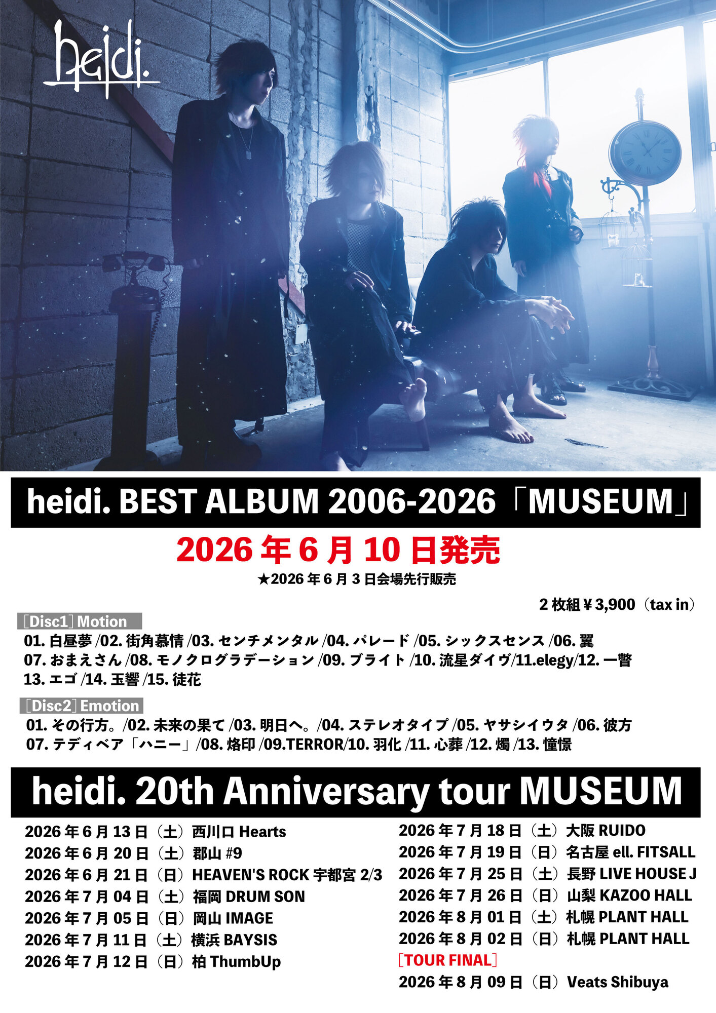 20周年を記念してメンバーセレクションベストアルバム「heidi. BEST ALBUM 2006-2026-MUSEUM-」の発売、そしてベストアルバムを引っさげて全国ツアー「heidi. 20th Anniversary tour MUSEUM」の開催が決定した。