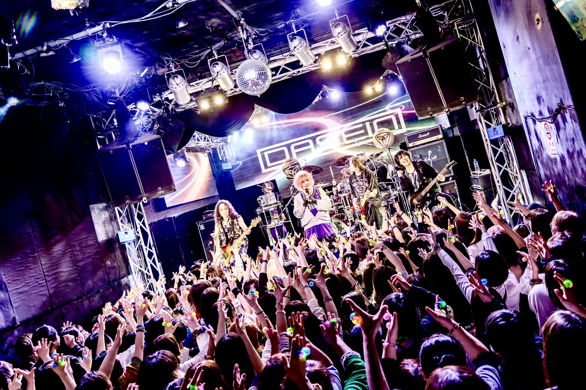 メロディアスな「陽炎立つ、夕闇に燃ゆ」からライブは後半に入り、ここではハイ・テンションな「サンザッパラ」やクールな歌中と大陸的なスケール感を湛えたサビを活かした「COGITO ELGO SUM」などが続け様に演奏された。荒々しさを打ち出したライブでいながら暴力的にいきあげるパターンとは異なり、鮮やかに登り詰めていく流れは心地よさに満ちている。そんなDASIENに牽引されてオーディエンスも華やかさと熱さがない交ぜになったリアクションを見せ、場内は大いに盛り上がった。