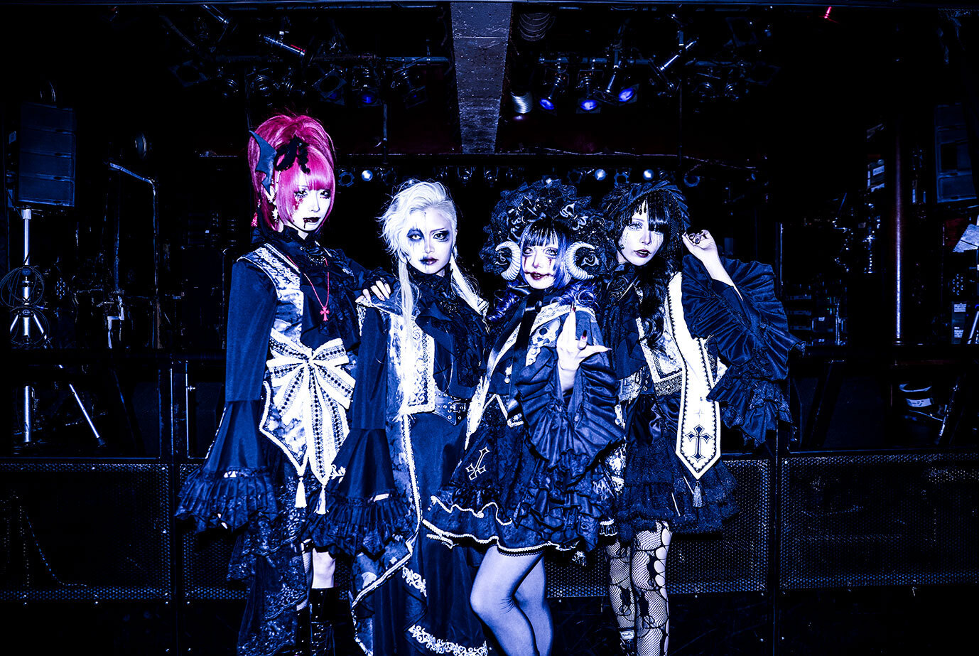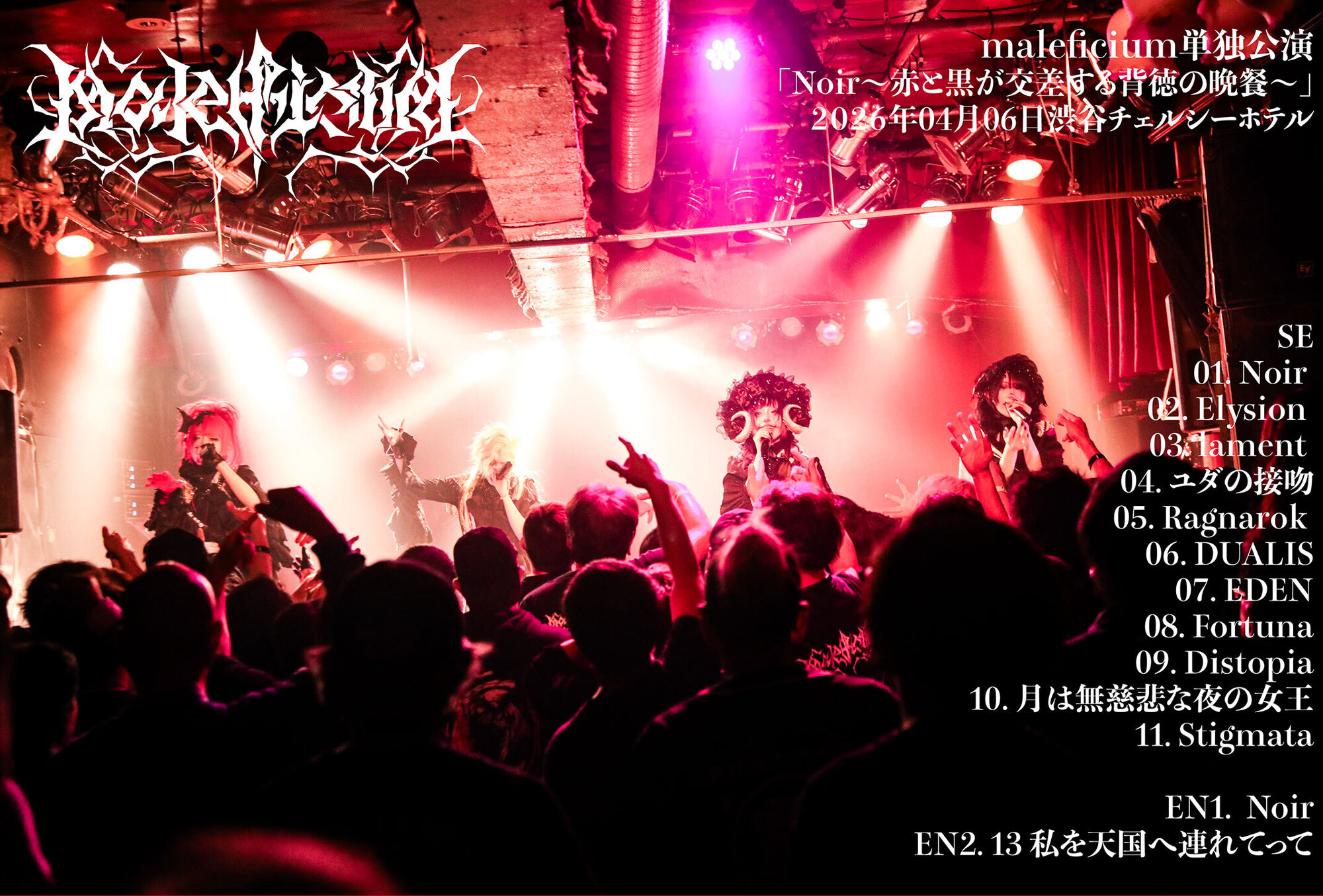 彼女たちは、「今が最強であり、最狂のメンバー」と口にしてきた。maleficiumの創設メンバー、夜縋らるむとCHIHO FUKUDA。maleficiumに赤い衝撃を降り注いだ、アルカード・アリス。新加入のセシルは、maleficiumに新しい化学反応を引き起こした。そんな4人だからこそ生まれたのが、最新配信シングル『Noir〜ノワール〜』だった。同曲を発表してからのmaleficiumは、より攻撃性を際立たせた楽曲に乗せて感情を剥きだしたライブ姿を毎回見せてきた。進化や変化を貪欲に求める彼女たちが、今ある一つの進化の形を示すべく、4月6日に渋谷チェルシーホテルでワンマン公演「Noir~赤と黒が交差する背徳の晩餐~」を行った。新衣装のお披露目公演にもなった、満員の観客たちを前にしたこの日の模様を、ここにお伝えしたい。