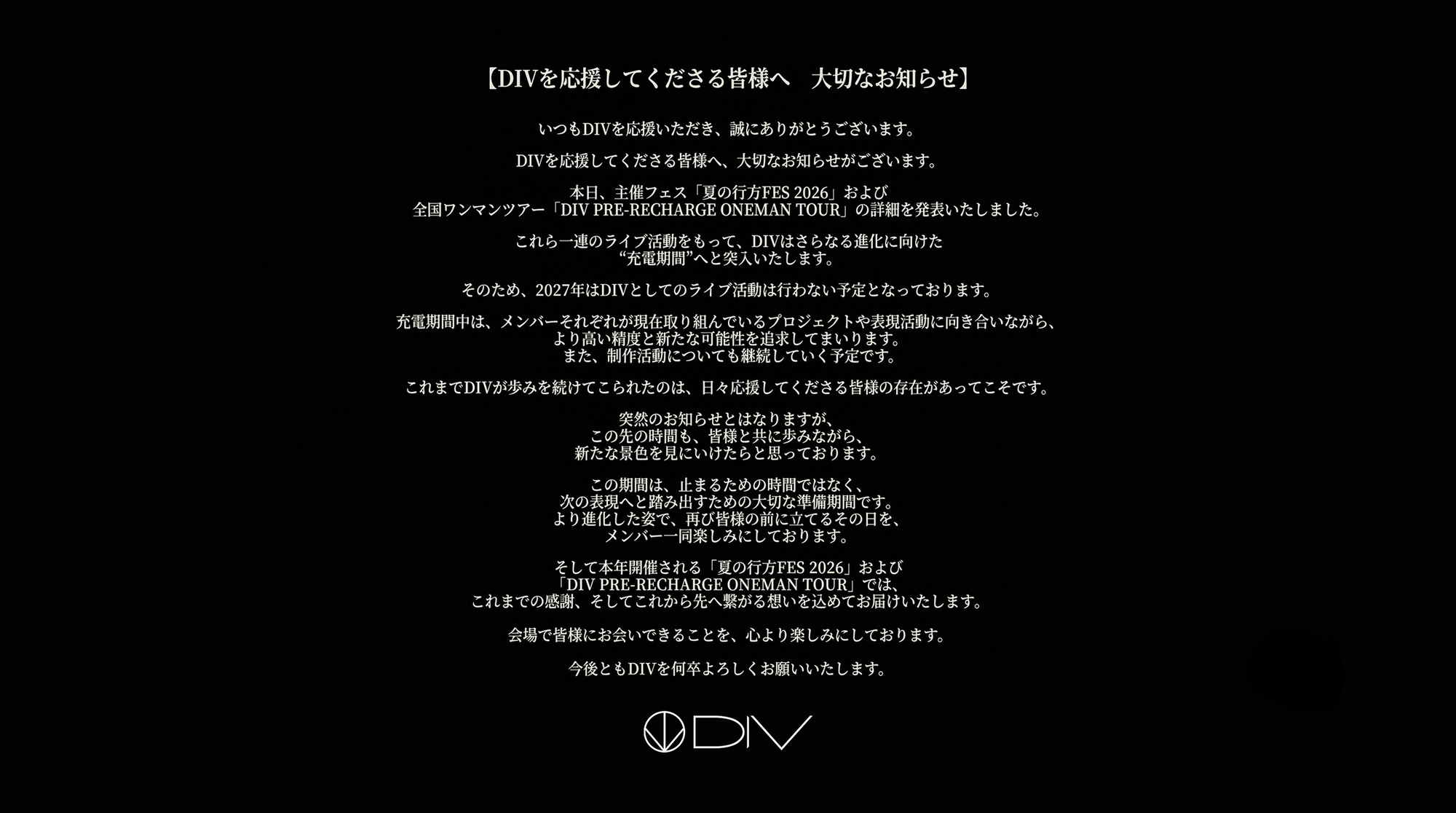 CHISA(Vo)、将吾(G)、ちょび(B)、satoshi(Dr)からなる4人組ロックバンドDIVが、2026年11月22日をもって次なるフェーズへ進むための“充電期間”に突入することを発表した。