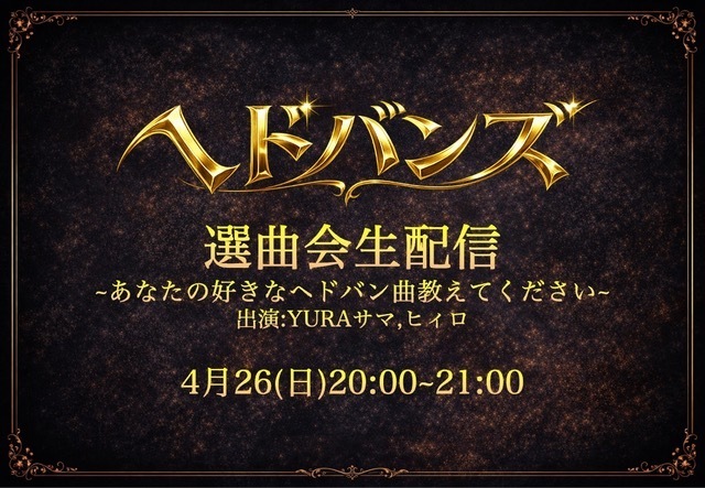 ヘドバン痛を軽くするためのアイテムの効果を実感させるために「実際にヘドバン痛を起こさせるライブ」をおこなうのは彼らならではの優しさなのかもしれない。しかも当日演奏するヘドバン曲のリクエストを募るために4月26日(日)の20:00よりYURAサマ・ヒィロによる『ヘドバンズ選曲会生配信〜あなたの好きなヘドバン曲教えてください』という番組の配信もおこなうとのこと。