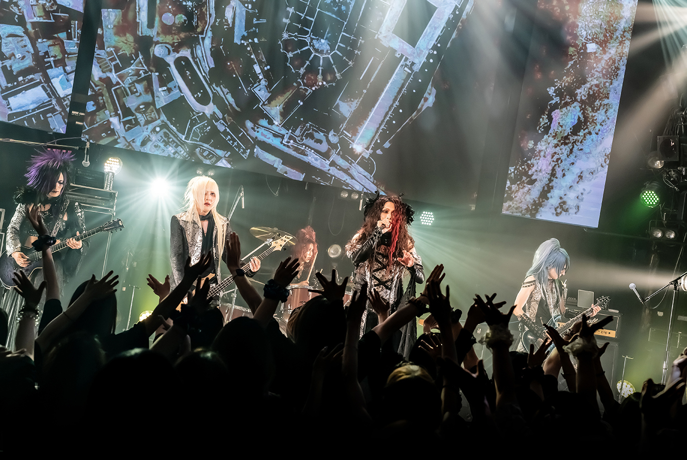壮麗かつシンフォニックな音色が流れるのに合わせて、背景に古城の景色が次々と映し出される。Kakeruへ導かれた観客たちが、高く拳を突き上げる。「生きる証を見せつけろ、気持ちを空へ高く上げろ!」。Kakeruの言葉を合図に、『Alive』が始まった。高揚感を覚えるメロディアスかつエモーショナルな楽曲だ。演奏中、4人の生きざまを刻んだ歌へ共鳴するように、フロアには無数の手の花がずっと揺れ続けていた。激しい演奏の上へ美しいメロディーと旋律を重ねることで生まれる高揚感と興奮。だから気持ちが熱く昂り、高く掲げた両手を輝きを放つ彼らへ向けて捧げずにいれなかった。