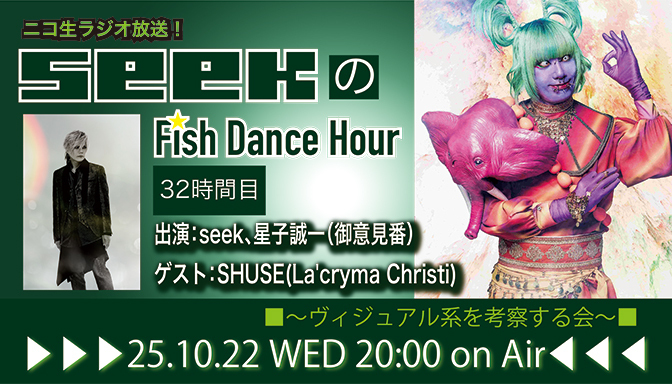 10月22日(水)20時より、seek(Psycho le Cému/MIMIZUQ)のニコ生ラジオトーク番組「seekのFish Dance Hour」<32時間目>がスタート!ゲスト:SHUSE(La'cryma Christi) !