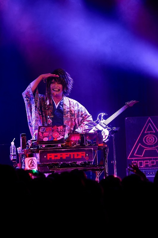 福助。の合図で、ピコピコとしたシークエンスな音が一気にバーストした。『僕と君の幸せ』でADAPTER。は、カラフルなのに破壊的なテクノサウンドを叩きつけ、場内の人たちを、気持ちが動くままに祭り上がる輩たちに染めあげた。甘さを隠し持った福助。の歌声と激しくもけばけばしいテクノサウンドがクロスオーバーしながら、この場にダンサブルでカオスな空間を作りあげる。そして…。