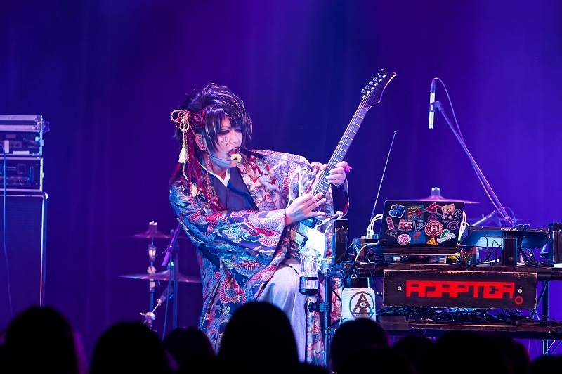 ギターを手にした福助。が次に繰り出したのが、激しく、華やかで、雅でダンサブルな『枯れ尾花』。一つ一つの音が刺激的でフリークなビートになって観客たちの心や身体を揺らす。雅で絢爛華美な演奏の上で、福助。が煽るように歌っていた。巧みに転調をしながら、ADAPTER。は観客たちを踊らせ、ときに頭を揺さぶるなど、終始華やかな。でも、どこか螺子の壊れた演奏の渦へと巻き込み、一人ひとりの頭の中から現実という景色を次々と消し去っていく。だから、ステージの上から派手に流れだす音の刺激にずっと溺れていたかった。