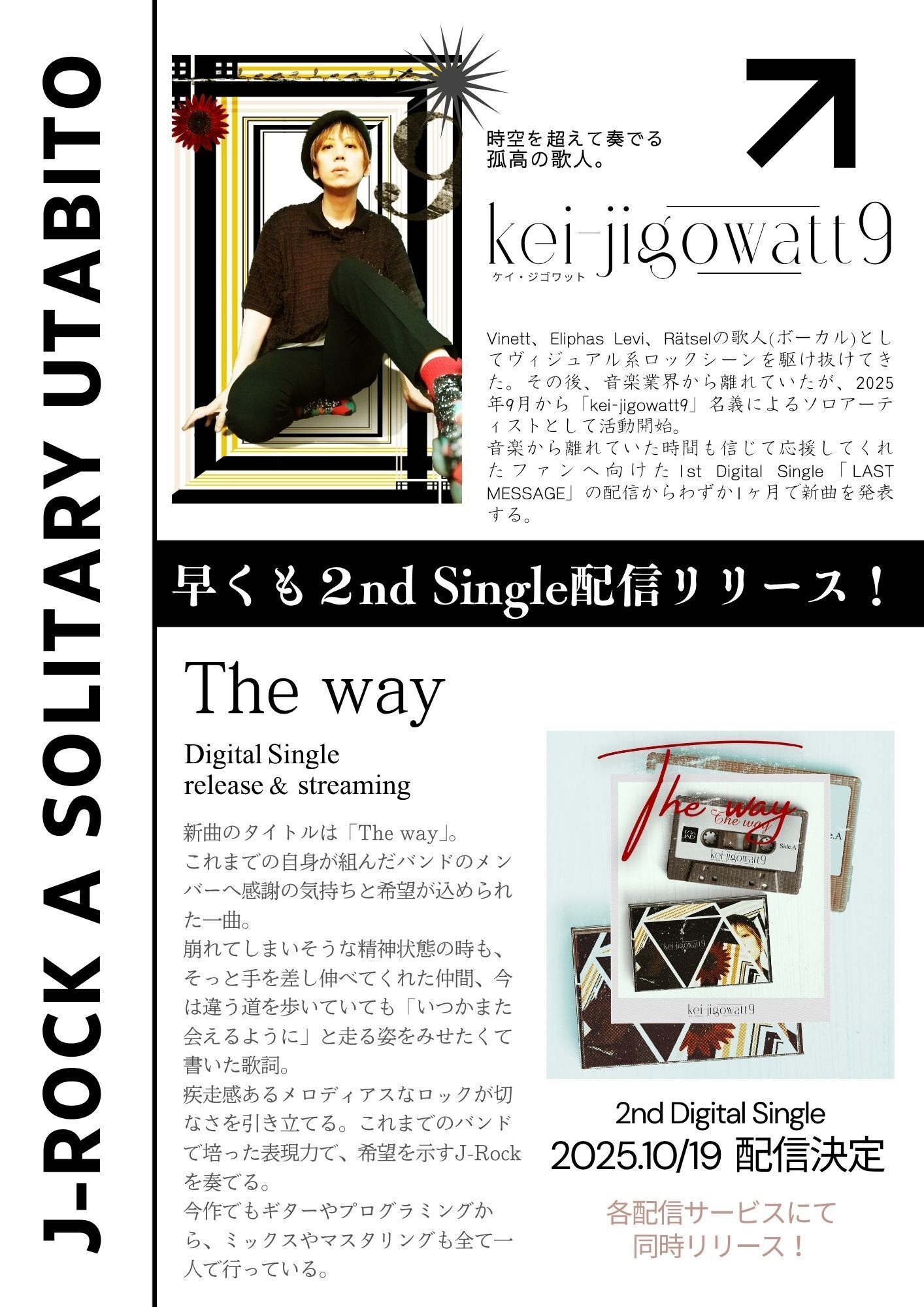 『The way』は、kei-jigowatt9がこれまで過去に組んでいたバンドのメンバーへ感謝の気持ちを込めて送る疾走感ある一曲になっている。