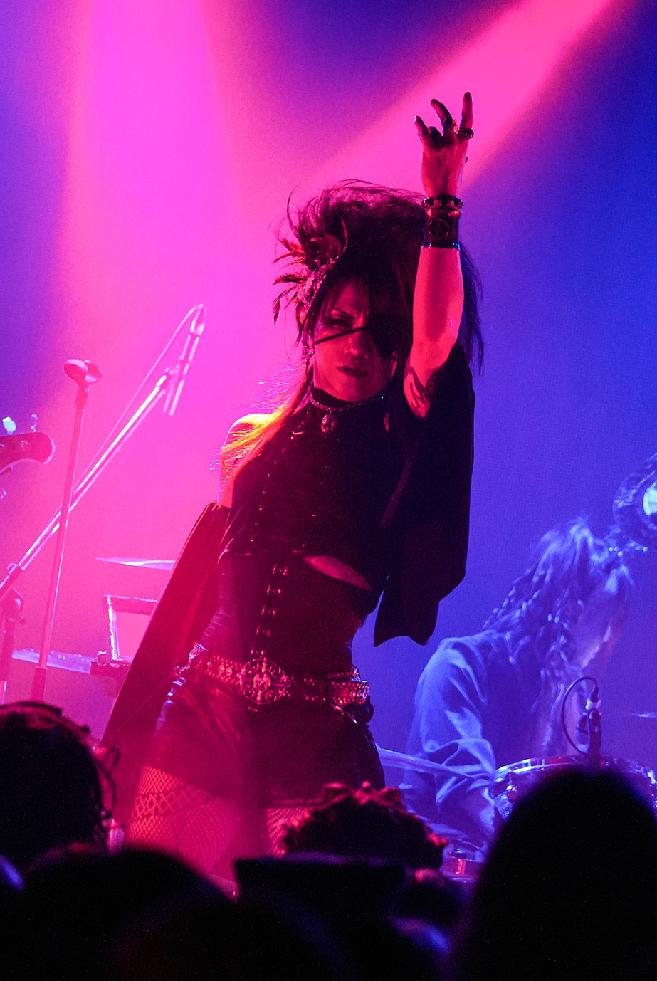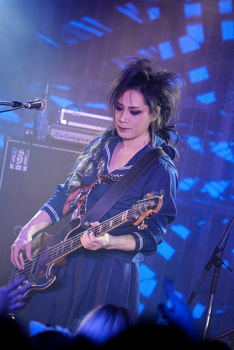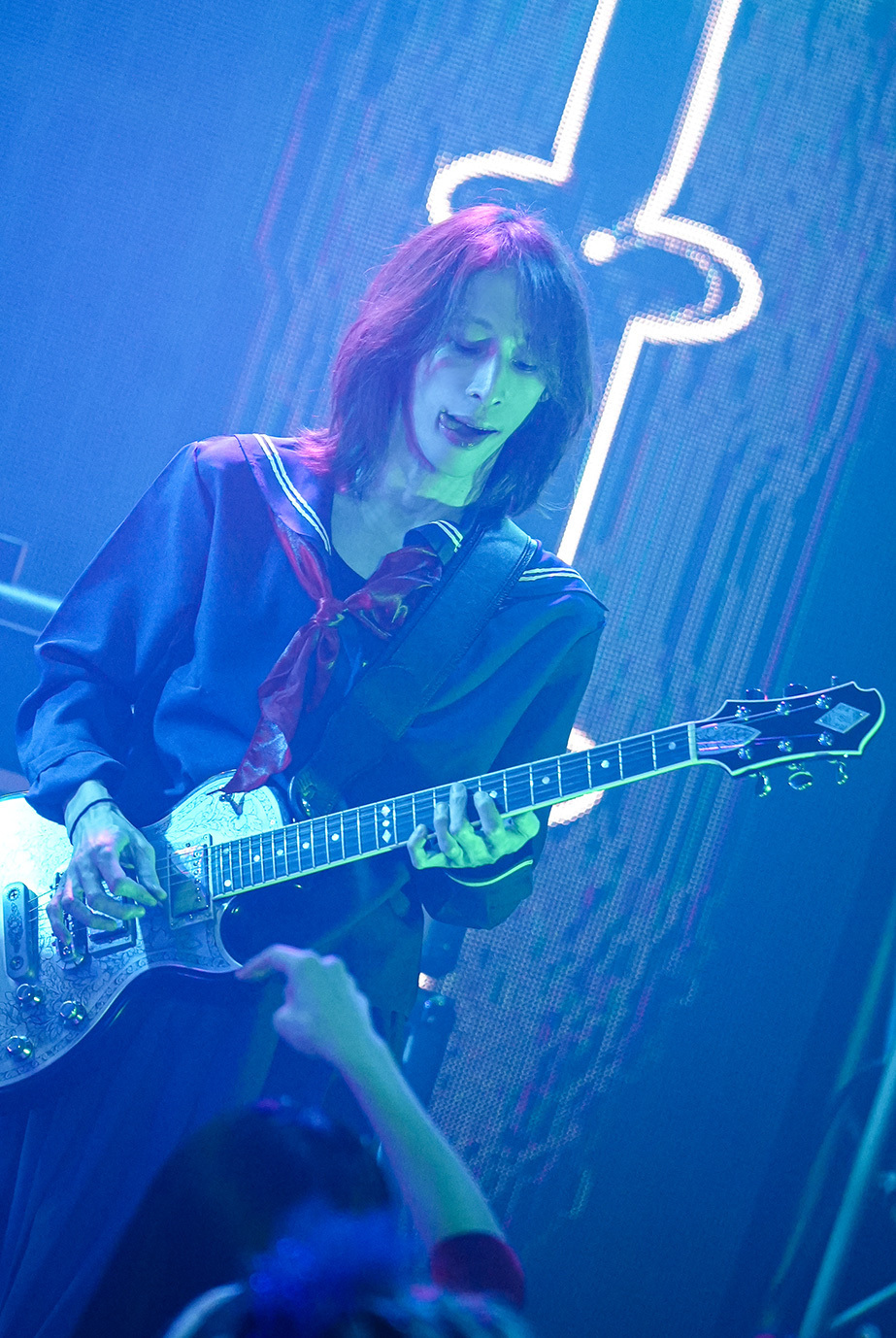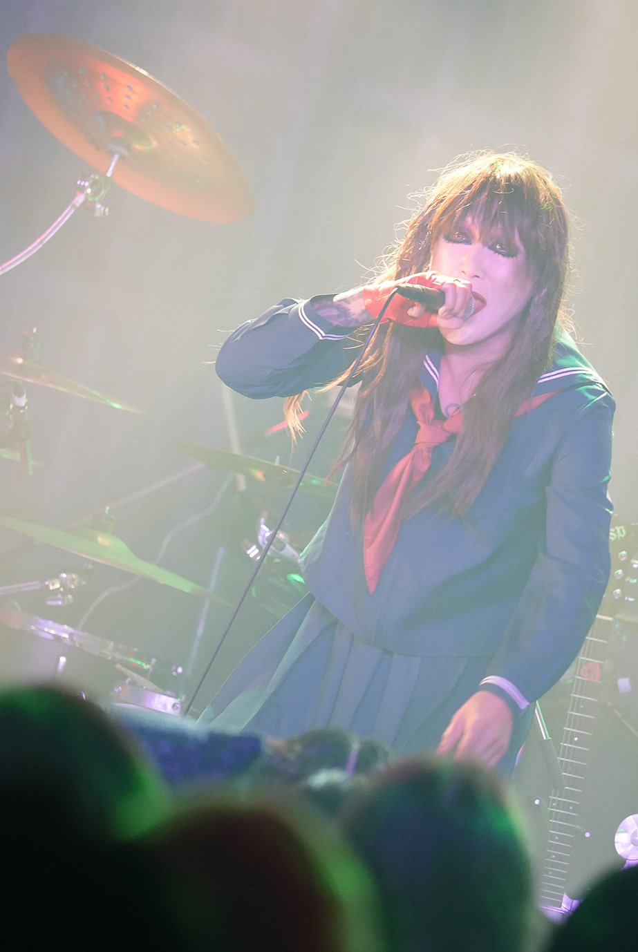 「ようこそ、暗黒の世界へ。ただただ暗黒に染まっていきましょう」「美しく舞い狂っていこう、狂い咲け!」の言葉を合図に、Moi dix Moisは『Forbidden』を演奏。冒頭から彼らは荒々しくて激しい、美しくも攻撃的な演奏を繰り出し、観客たちの理性を破壊してゆく。刺々しいリフを次々と刻む演奏に乗せ、Sethが感情を荒らげた声で襲いかかる。フロアでも、大勢の人たちが身体を小刻みに揺らし、手を高く掲げ、ときに声を張り上げて、高ぶる想いをメンバーらへぶつけ返していた。つねにシンフォニックとゴシック&ラウドな表情をクロスオーバーしてゆく様が、とても刺激的だ。