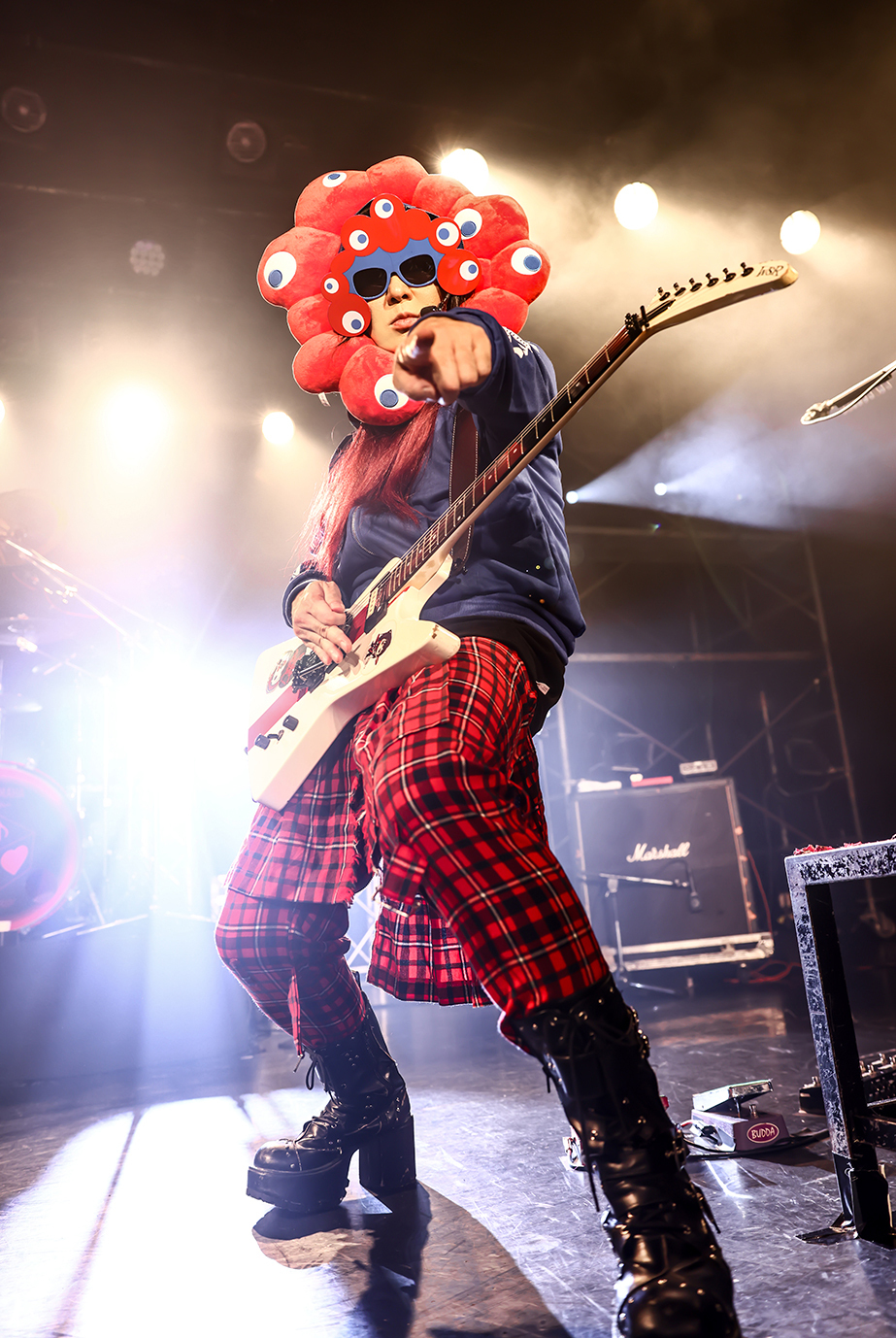 完全なる出落ち芸でファンを笑わせながら、アタマサビ以降は通常通りにHAKUEIがメインヴォーカルをとり、千聖はほとんど手元も見えないであろうに、ミャクミャク化したままでギターを弾いて行くという荒技までみせてくれたのだから恐れ入る。ちなみに、ミャクミャク化のための小道具や衣装は全て「フリマサイトで集めた(笑)」のだとか。千聖はこのあとのバースデー・セレモニーでも、ミャクミャク姿のままケーキを前にメンバーと写真撮影していたことをここに付記しておこう。