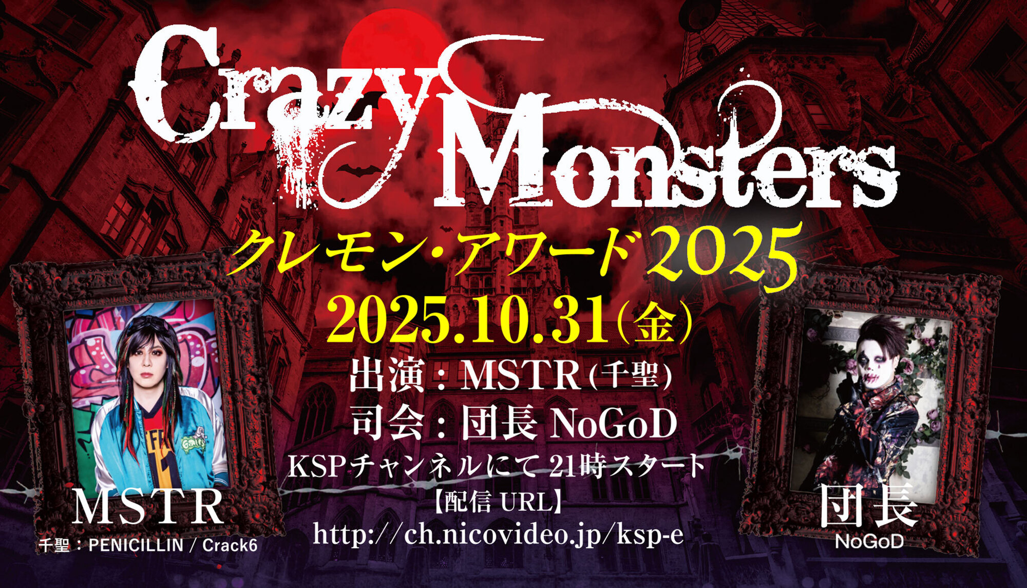 毎年恒例 PENICILLIN ギタリスト 千聖 こと MSTR 率いる“クレモン” Crazy Monsters Halloween Party 2025 二日間のタイムテーブルが解禁! クレモン仮装大賞は誰の手に! 2025年10月31日 「クレモン・アワード 2025」KSPチャンネルにて 21時スタートで生放送決定!