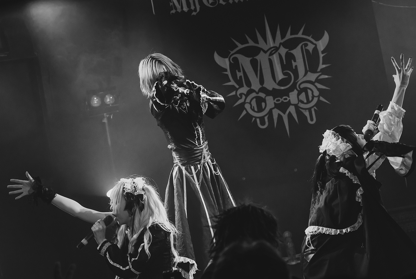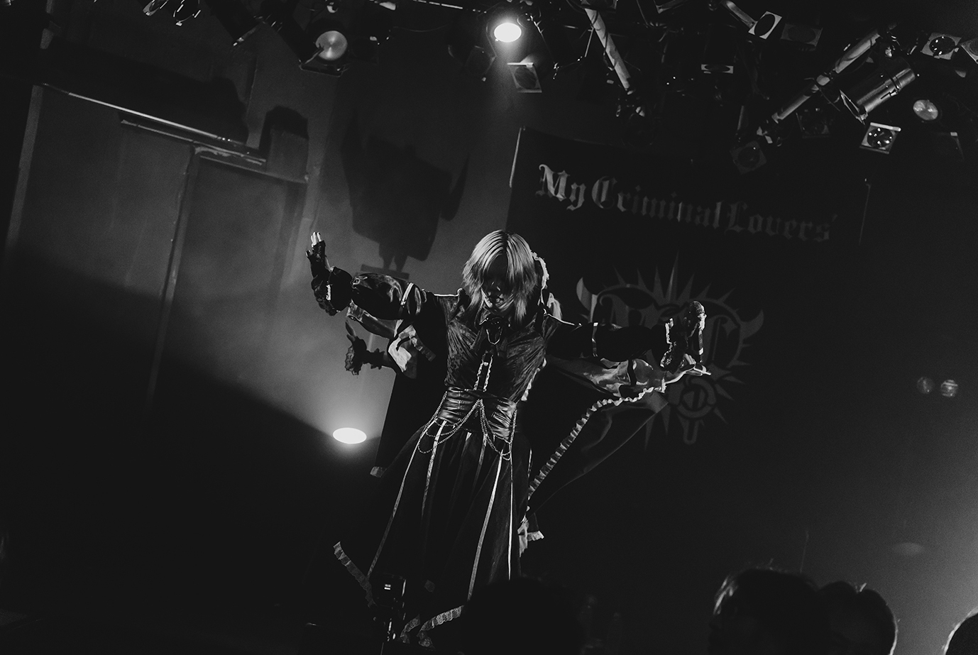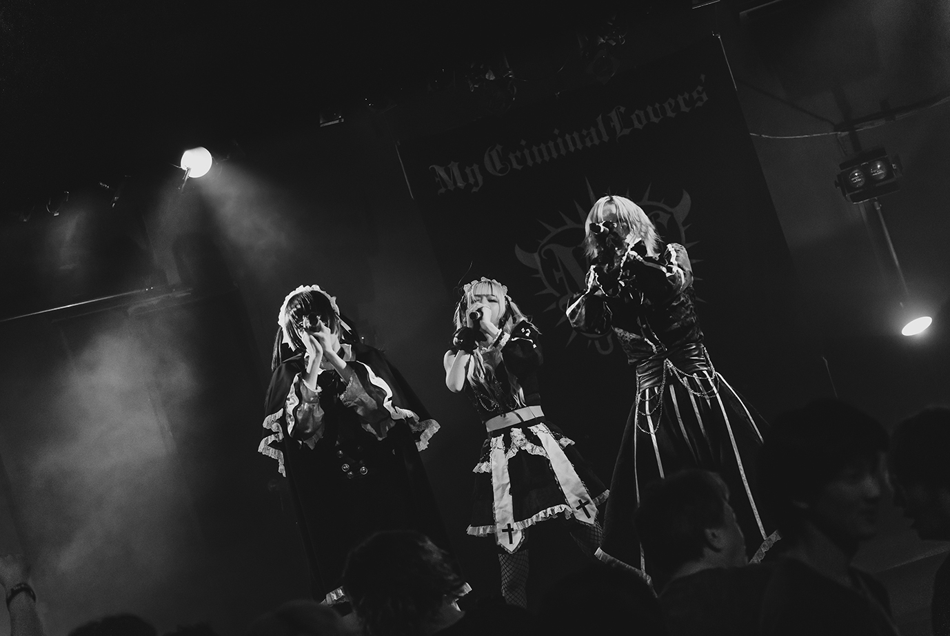 美しくも哀愁を帯びた音色が響きだす。3人は想いを一つに重ね、気持ちの揺れが伝わる声で『ヴェノム』を歌っていた。美しく舞い踊りながら歌う一人一人の声から感情の揺れが伝わるからこそ、その想いをしっかりと受け止めていたかった。一変、藍月ノエルのデスボイスを合図に、猛々しい轟音が鳴り響いた。My Criminal Lovers'は『ANUBIS』を通して、オーディエンスを心の闇へと誘い込む。主人公の塞ぐ心模様を、彼女たちは歌声を通してドラマチックに描きだす。轟音ラウドな楽曲を背景に、ときに藍月ノエルと小夜住志唏がデスボイスをかけあうなど、3人が冥界へ誘うように感情的に歌う姿も印象的だった。